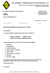 Liebe Mitgliederinnen und Mitglieder, wir laden Euch herzlich zur Mitgliederversammlung 2017 des VFC Kirchenlamitz ein. Die Tagesordnung ist dem Beitrag zu entnehmen.